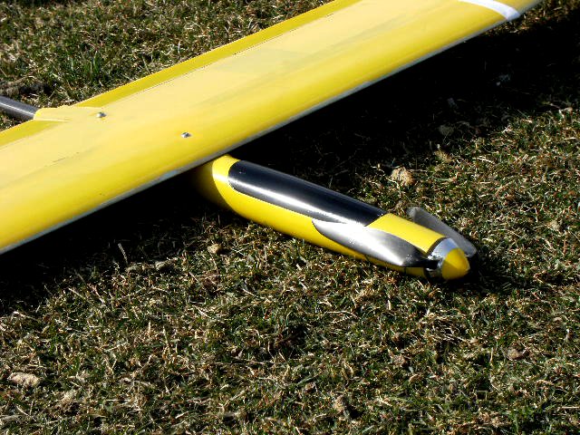 The weight of Jacques` model sums up to 55oz (3.44lb) and is divided as follows: Weight distribution: Motor: 191 grams Battery: 220 grams Prop & spinner: 34 grams ESC: 47 grams Center panel: 423 grams (including harness, 2 Futaba S3150 for flaps & carbon joiners) Mid panels: 134 grams each Tips: 89 grams each Fuselage: 516 grams (loaded with battery pack, ESC, motor, Rx and 2 Hyperion HP-DS09-AMD servos installed into the rudder) Horizontal stabiliser: 30 grams Total AUW: 1600g........57oz The motor installed is specifically designed to work in conjunction with a powerful 3S LiPo battery pack. The unit can deliver 450W (static on ground) with a 12.5x6 prop while absorbing 40A. The glider has proven to be able to climb at an altitude of 200m in approximately 20sec, averaging a good 10m/s climb rate. Motor: MEGA 22/3S Prop AeroNaut CAM 12,5 x 6 Battery: Turnigy Nano 2250 maH 65C ESC: HET 75 The specific power equals to 126W/lb, which is the typical "rule of thumbs" number you are looking for, when designing such a ship. The motor can actually absorb 70A for a limited period of 30s, giving to Jacques an upgrade possibility: installing a 13x8 prop and the same 3S battery the unit can deliver 600W (168W/lb) which will turn into almost 14m/s climb rate!!! eBD J mk2 Jacques went a step ahead and changed some of the features of his eBD. The objective of the rework was to shed away some weight from the tail feathers to achieve proper balancing without extra nose ballast.