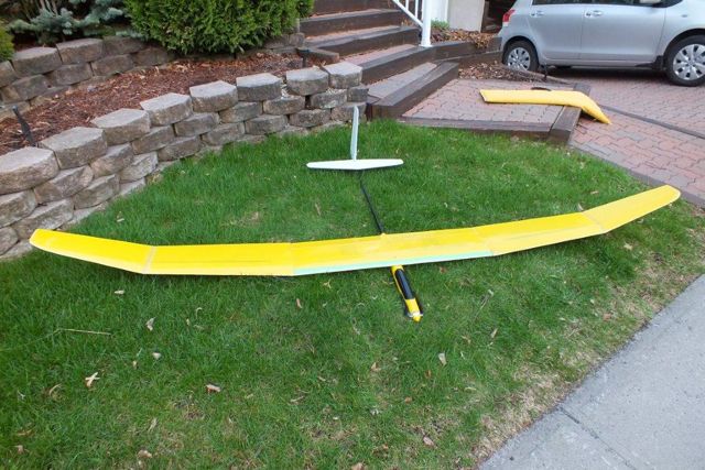 eBD D Composite wing and composite fuselage with original X-tail feathers. The model sports a composites "winch proof" Bubble Dancer wing. Duc has decided to install a Drela style fin and rudder resulting in a huge tail group! This gives to the model great handling characteristics.