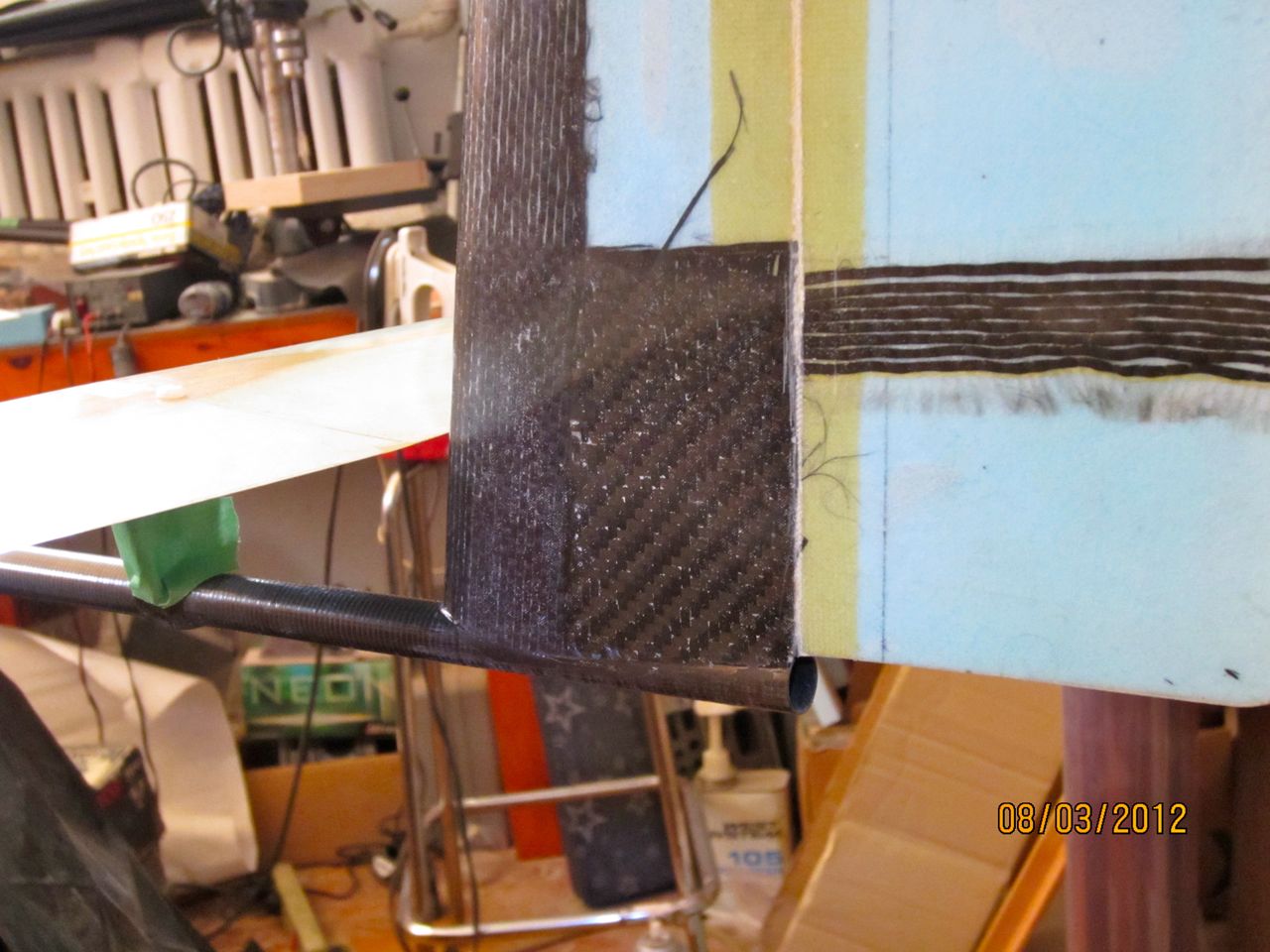 The wing sections are taken from the AG series. The sections evolve from a 8.24% thick AG24 at the root to a 6.8% thick AG26 at the tip. The wing is extremely thick so that structures must be carefully designed. The wing sizing has taken into account the lessons learned on the previous project KUDA. A spreadsheet is in place giving thickness of spar caps, shear web, skin sizes depending upon estimated loads. The weight target was set at 3lb and the load factor at 25g. The loads in flight will never be as high, but we wanted to keep some margin because we all know that landings can be rough when the pilot wants to "hit the spot at the right moment".