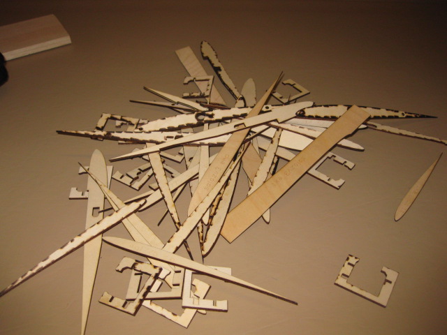 Wooden ribs, servo mounting plates & CO 31 March 2010 The appetite comes by eating...the laser cut machine works perfectly therefore we have generated the .dxf files and cut the rest of the components. All the ribs and the servo mounts have then been assembled. Sweet!!!