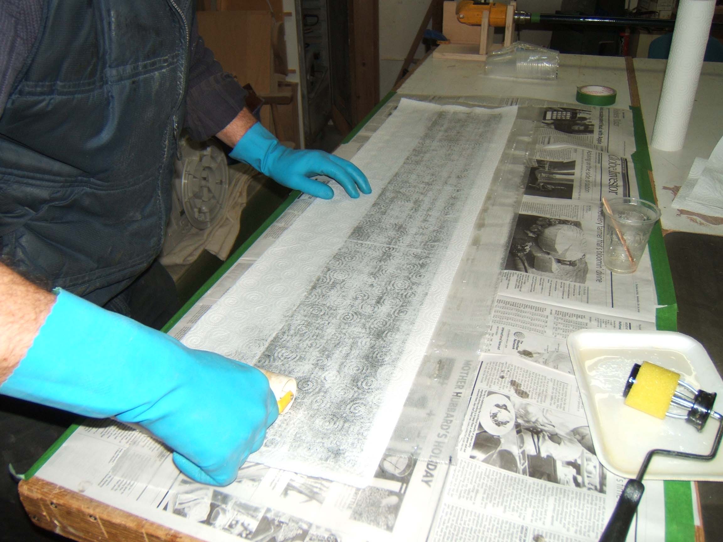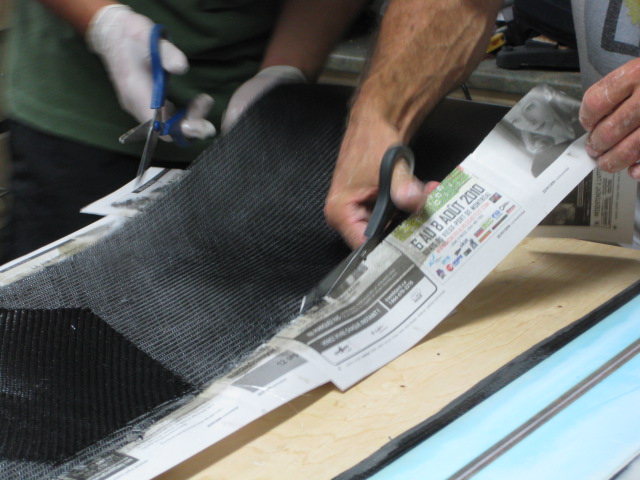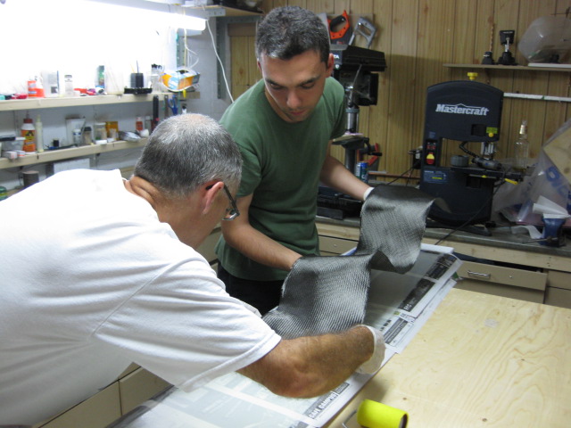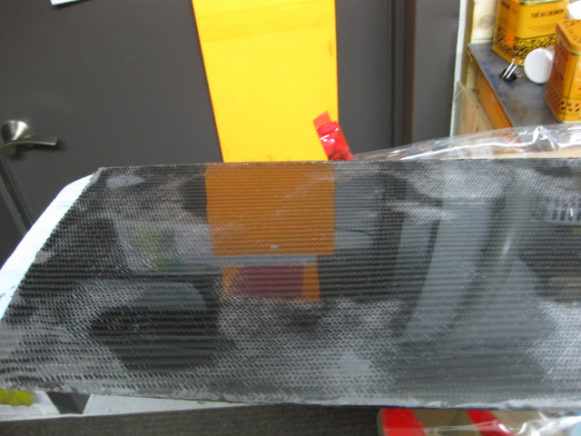 Time to layup the cloths. First the .25oz glass, very carefully with a light brush. This thing is so fin it can give real hard time when laying-up! Electrostatic charges are your friend here, helping you out to keep the cloth onto the mylar. Then it comes to the structural plies: 6oz carbon...way overkill, but so easy to layup and work with altogether!