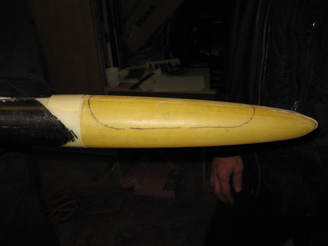 First fuselage 18 April 2010 The first fuse has been taken out of the mould. A wise combination of glass, kevlar and carbon fiber cloth for a 2.4GHz friendly fuselage. Some minor defects over the pylon area but already a very good weight to stiffness ratio. As a matter of fact the weight is equal to the original Supra but our design is a little larger...I don't know how Steve can squeeze so much resin out of the layup, kudos to him!!!