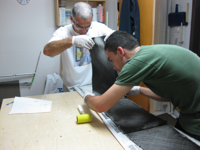 Wing central panel - Step 1 30 June 2010 The wing skin of the central panel has been draped by Stephen and Jacques. Everything went well and the result is excellent. Look at the shiny finish and precise fiber position. Nice job guys!