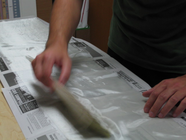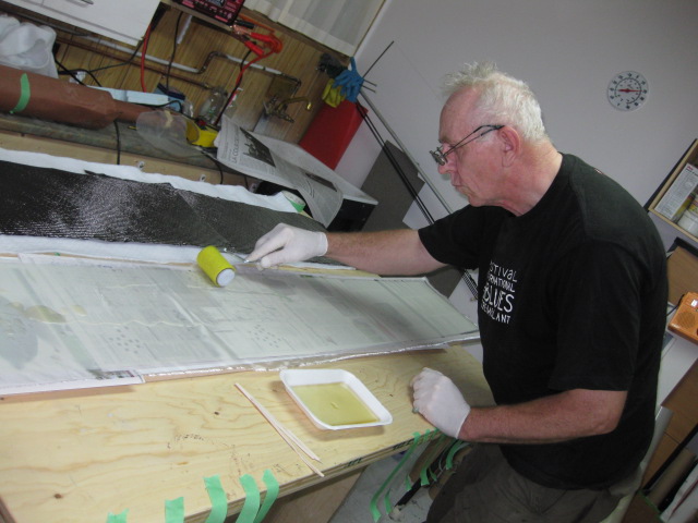 When the laminate is ready, we transfer it to the foam which has been wetted all around the edges, in the region of the main and secondary spar as well as the bolt beam area and tip ribs. When everything is in the right place, some tape is used to keep the whole thing together while we handle the vacuum bag. Careful here, the mylar is waxed and the tape doesn't want to stick anywhere!!!