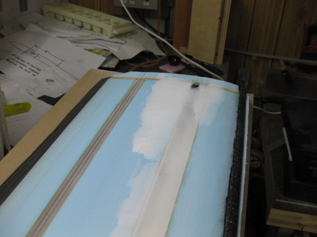 Wing central panel - Step 2 6 July 2010 The foam corresponding to the main spar location has been removed and a specific Jig has been built to route the harness for the radio gear close to the spar web.