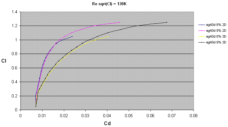 The root section of the Supra is scarily thin being 8% thick only. A thicker section would give higher bending stiffness properties, reducing tip deflection, but with which aerodynamic penalty? XFoil has been used to check if a thickened Ag40 would be the airofil of choice. As shown in the picture hereunder, a thicker airfoil shows better performances at mid to high Cl,while the thinner section seems being less draggy at the low Cl. A quick estimation of a full wing (induced drag approximated using Cl2/(Pi * AR) being AR = 20) has been performed too, showing that eventually the penalty is very reduced. The curves are so close that we can even claim we have a little advantage against the original section (after all "you believe in what you want to believe"...isn't it? :-D). It is no surprise really, thicker airfoils are more tailored for higher Re!